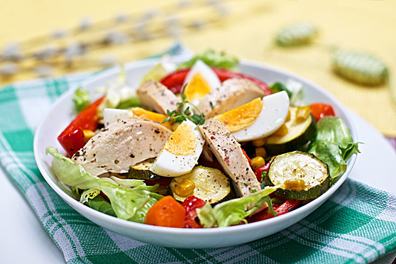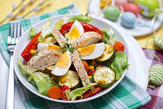 Oczyść paprykę i pokrój w plastry. Marchewkę obierz i również pokrój w plasterki. Cebulę pokrój w krążki. Otocz sosem vinaigrette, umieść w naczyniu żaroodpornym w zapiekaj w 180°C. Po ok. 10-15 minutach dodaj pokrojoną w talarki i również zamarynowaną w sosie vinaigrette cukinię. Po 5-10 minutach dodaj odsączoną z zalewy kukurydzę i pokrojonego na plastry kurczaka. Piecz kolejne 10 minut. W międzyczasie ugotuj jajka na twardo.