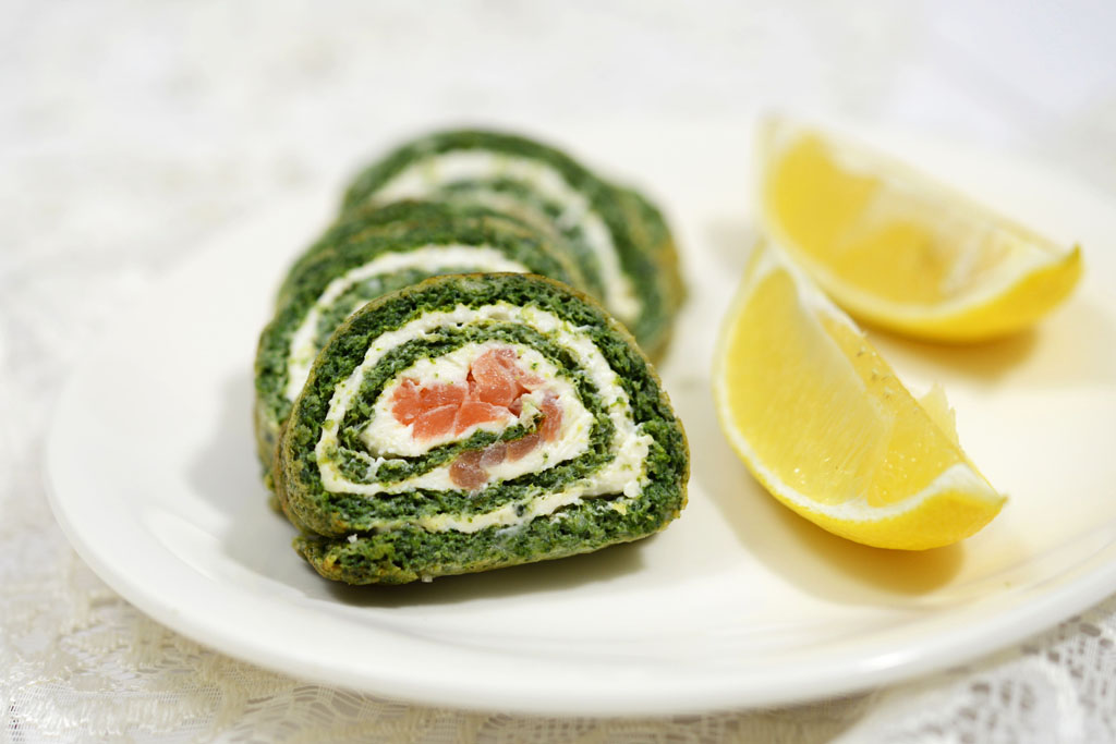 Omlet z dodatkiem szpinaku, przygotowany w piekarniku, a następnie nadziany pysznym chrzanowym serkiem i wędzonym łososiem. Bardzo ładnie prezentujące się roladki stanowią świetny pomysł np. na imprezową przekąskę.