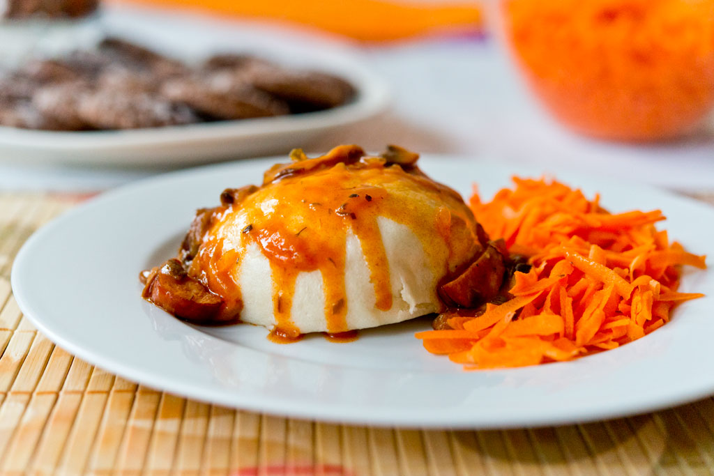 Ponownie zagotuj sos, ewentualnie dopraw do smaku świeżo mielonym pieprzem. Podawaj z pyzami i (najlepiej) ulubioną surówką, np. surówką z marchewki i jabłka. Również sama starta marchew pasuje. Danie jest samo w sobie bardzo aromatyczne, więc nie potrzebuje doprawionego dodatku.