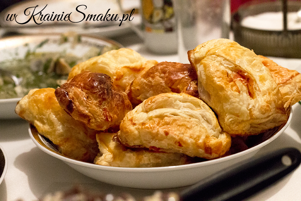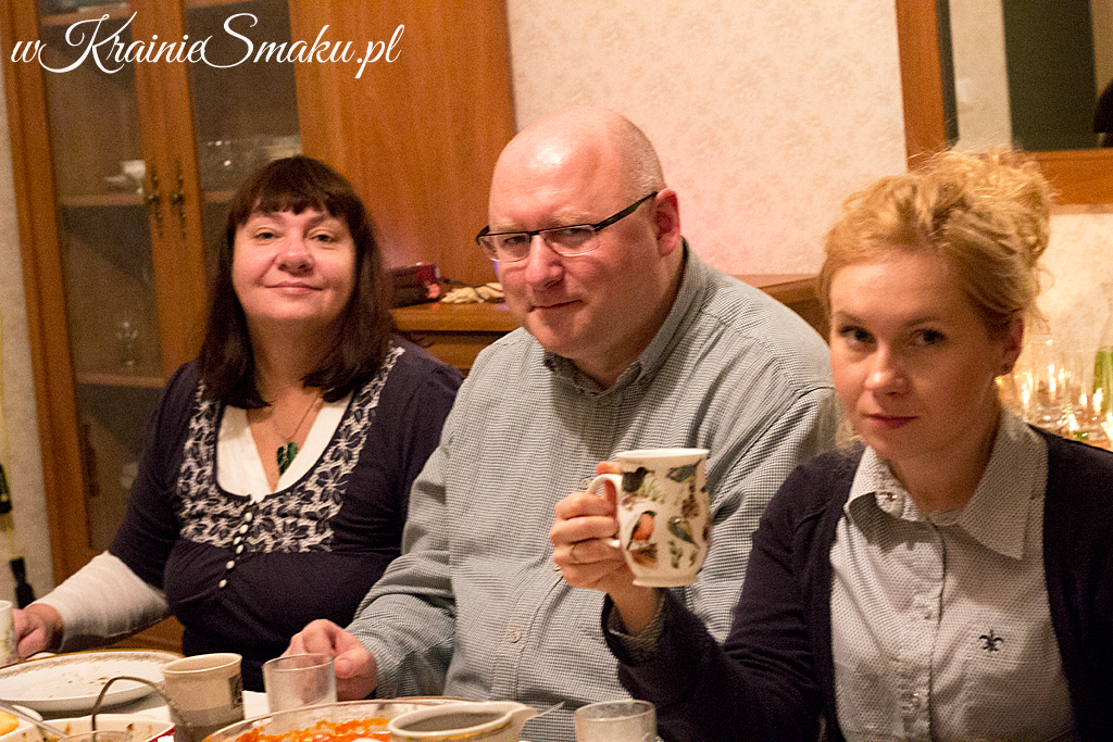 Chyba nawet nie muszę pisać, że wszystko było smaczne. Jedzeniem cieszyliśmy się ogromnie cały wieczór, ale nie mniej swoim towarzystwem. Rozbrzmiały opowieści o tym co przyrządzamy na święta. Ania gorąco polecała sałatkę z ziemniakami, śledziem i korniszonami, doprawioną młotkowanym zielem angielskim. Piotr Straga wspominał o różnych pomysłach na grzyby, Grażyna o pierogach. Ja przy okazji polecałam gorąco moje niedawne „odkrycie” – pierogi z kaszą jaglaną i serem a’la ruskie (wraz z Jolą, która zrobiła w ten weekend bardzo podobne).