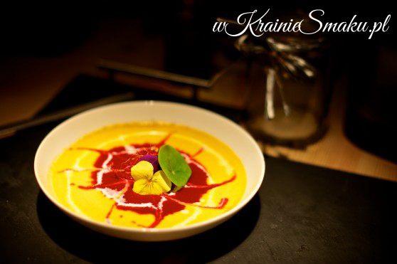 Podanie: W płytkiej miseczce umieść krem z marchewki. Na jej środek delikatnie wlej krem z buraczków i malin. Zrób cienki okrąg ze śmietanki, po obwodzie kremu buraczkowego ok. 1 centymetr od brzegu. Wykonaj wykałaczką ozdobny wzorek, „malując” w czterech miejscach literę „S” (tak jak na zdjęciu). Bezpośrednio przed podaniem udekoruj zupę liściem nasturcji i bratkiem. To oczywiście krok opcjonalny, bez dekoracji zupy też smakują wspaniale :).
