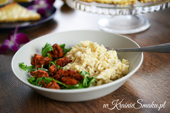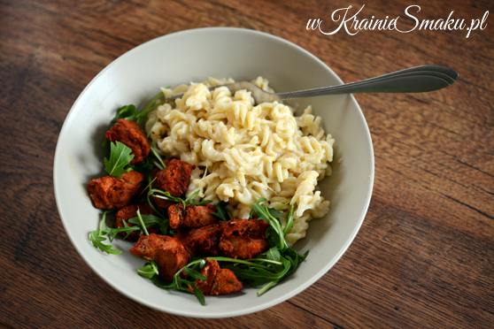 Bardzo prosta, pieczona polędwica, w marynacie do której po raz pierwszy dodałam przecier pomidorowy. Jego lekko słodki smak bardzo dobrze komponował się z ziołami i chili. Mięsko podawałam ze świderkową wersją słynnego amerykańskiego macaroni and cheese. Więcej o historii tego specjału możecie przeczytać w tym artykule na portalu Marthy Steward. Moja dzisiejsza wersja nie była zapiekana, a tzw. „stove-top”, czyli przyrządzana w garnku, znacznie szybsza. Zamiast tradycyjnego cheddara użyłam pyszny, polski długodojrzewający Rubin. Danie doprawiłam tylko solą i pieprzem, ponieważ nie chciałam niczym maskować unikalnego smaku sera. Jednak stosując mniej aromatyczny ser, np. goudę, można dodać odrobinę czosnku lub ziół. Absolutnie nie polecam musztardy Dijon i sosu Worcester – testowałam. Makaron z serem dobrze łączył się natomiast z rukolą, którą wmieszałam już na talerzu.