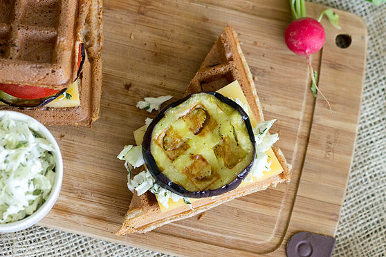 Podanie: Podawaj gofry z serem Rubin, sałatką z kapusty pekińskiej i wybranymi (lub wszystkimi) warzywami. Bakłażan dopraw solą i pieprzem i zgrilluj przed gałożeniem na gofra.