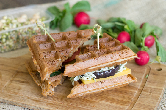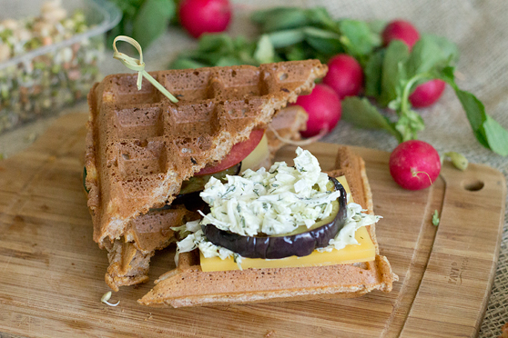 Wiem, wszyscy lubimy słodkie gofry. Ale wierzcie mi, w wersji wytrawnej też smakują świetnie. Dziś podałam je z długodojrzewającym serem, surówką z kapusty pekińskiej oraz bakłażanem zgrillowanym w gofrownicy! Całość przegryzałam świeżymi warzywkami: rzodkiewką, ogórkiem, pomidorkiem i mieszanką kiełków na patelnię. Polecam!