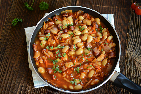 Taka prosta, szybka (gdy już mamy gotową fasolę) i o wiele zdrowsza wersja fasolki po bretońsku. Bez boczku, jedynie z dobrymi (naprawdę trafiłam na świetne) frankfurterkami i dużą ilością warzyw.