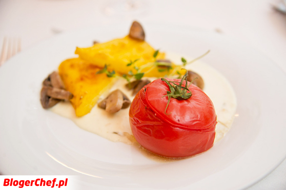 Kolacja również została utrzymana w duchu vege. Przystawkę stanowiły pyszne naleśniki z niecodziennie przygotowanym farszem z sera i papryki. Jako pierwsze danie podano zupę z pora, jako danie główne polentę w sosie śmietanowym, smażone pieczarki i faszerowanego pomidora, a na deser dostaliśmy mrożony tort bezowy.