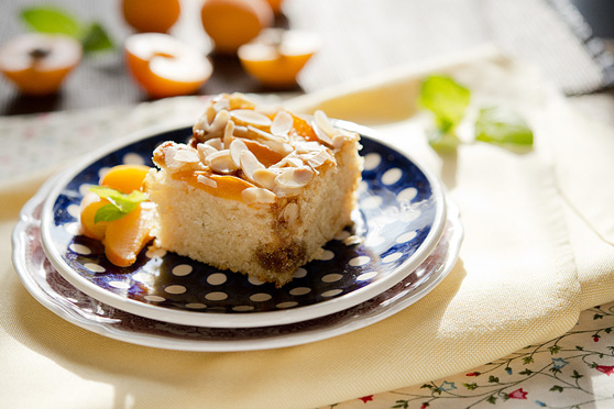 Wyłóż ciasto do kwadratowej blaszki o wymiarach 20 x 20 cm, pokrytej papierem do pieczenia. Na wierzchu rozłóż kleksy masy kajmakowej, a na to plasterki moreli. Posyp płatkami migdałowymi. Piecz w 180°C do tzw. suchego patyczka, czyli ok. 30 minut.