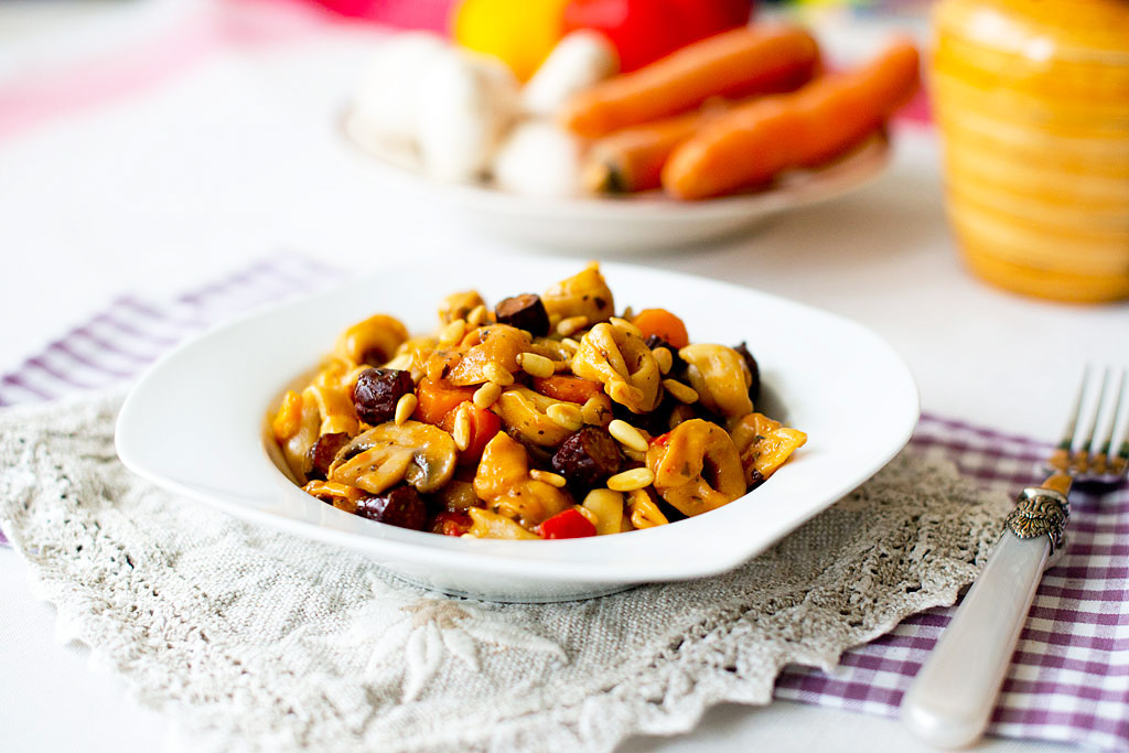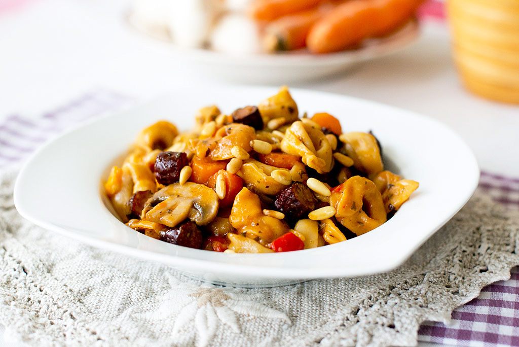 Pomysł na jesienny, aromatyczny obiad z jednego garnka lub dużej głębokiej patelni. Mało mycia, a za to dużo smaków – warzywa fajnie łączą się z wędzonym kabanosem i tortellini. A wypływająca z tych włoskich pierożków skrobia naturalnie zagęszcza sos. Polecam również wersję tego dania z kurczakiem lub mięsem mielonym (dowolnym – wołowym, z szynki wieprzowej, drobiowym). Zamiast tortellini można oczywiście dodać makaron w ulubionym kształcie.