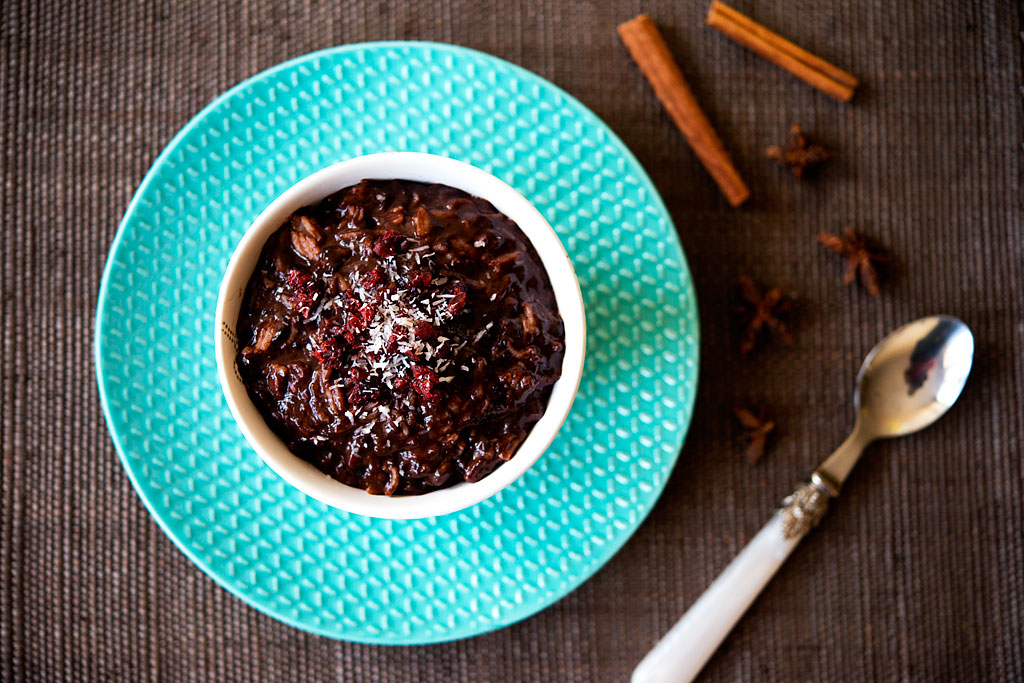 Słodkie małe danie lub przekąska, która stanowi połączenie budyniu, ugotowanego ryżu i korzennych przypraw. Wersja ze zdjęcia jest na czekoladowym mleku sojowym, ale oczywiście można zrobić na tradycyjnym krowim. Wtedy należy jednak całość dosłodzić albo użyć budyń z cukrem. Ryż najwygodniej użyć ten, który został z obiadu. Mnie bardziej pasuje ten krótkoziarnisty niż długoziarnisty. Również ryż jaśminowy jest ok. Polecam również wersję bez czekolady, np. śmietankową lub waniliową. Wtedy dobrze sprawdzi się dodatek rodzynek lub innych suszonych owoców. Do czekolady fajna będzie suszona śliwka albo banany.