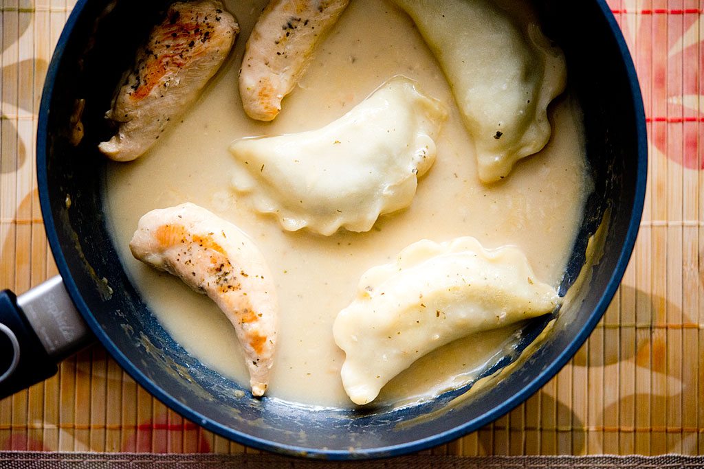Mimo, że pierogi nie są moim ulubionym obiektem do fotografowania zmotywowałam się by sfotografować te. Bo pomysł o którym piszę poniżej, choć banalny w swej prostocie, dla nas jest niedawnym odkryciem, które warto zapamiętać. Sos śmietanowy jest super do odgrzewania pierogów – nie są wtedy tłuste jak po smażeniu, ani tak „rozmyte” jak po tradycyjnym gotowaniu w dużej ilości wody. Gdy brakuje czasu można skorzystać z gotowego sosu – serowego, śmietanowego z ziołami, grzybowego itp.