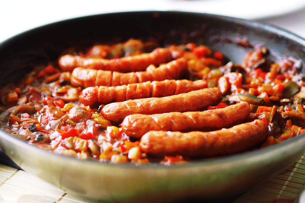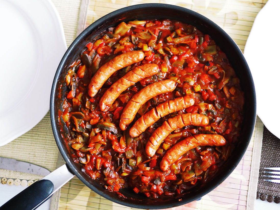 Słodko-kwaśny sos pomidorowy z pieczarkami i dużą ilością warzyw, który swój charakterystyczny smak zawdzięcza dodatkowi ketchupu oraz ogórków kiszonych. Doskonale pasuje do wędzonej grillowanej kiełbasy. Danie można podawać z tostowanymi kanapkami z serem, makaronem, ryżem lub wybraną kaszą. To naprawdę fajny sposób na „zwykłą” kiełbasę.