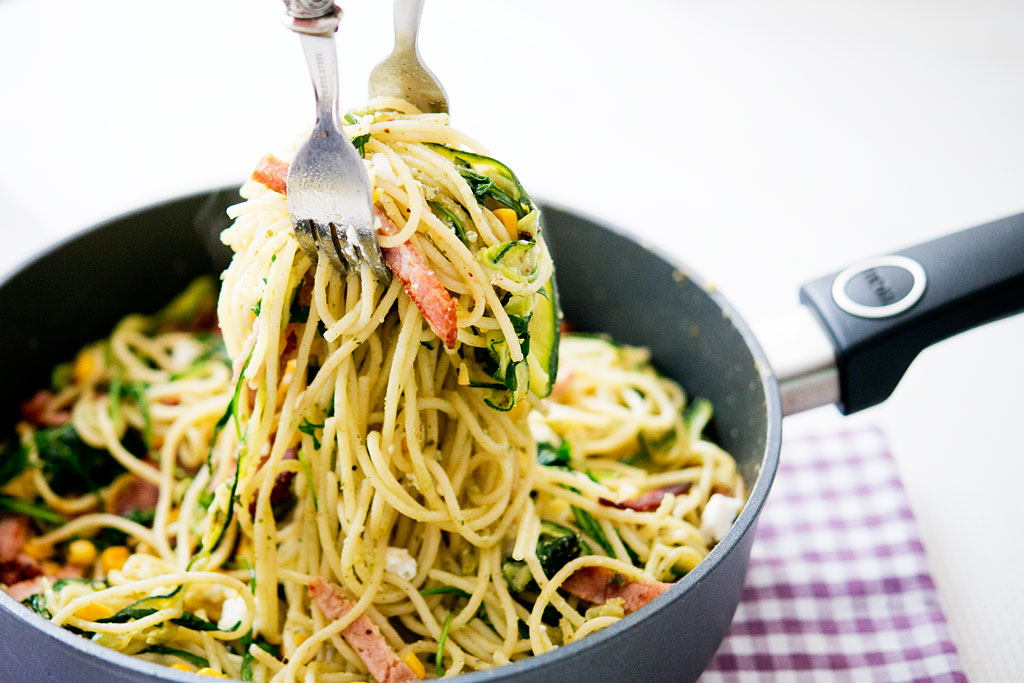 Polędwica pokrój w plastry i zgrilluj na suchej patelni. Cukinię pokrój w paski obieraczką do warzyw. Na głęboką patelnię wyłóż nieco pesto i przesmaż (bardzo krótko) cukinię. Dodaj makaron, kukurydzę oraz rukolę. Dobrze wymieszaj, po czym wmieszaj pokrojoną w paski zgrillowaną polędwicę. Dopraw do smaku solą, świeżo mielonym pieprzem i ostrą przyprawą. Podawaj od razu.