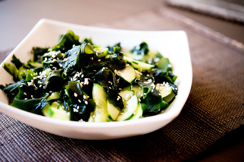 Obieraczką do warzyw zetrzyj paski skórki ogórka, tak by miał paski z widoczną skórką i bez (to tylko dla efektu wizualnego). Przekrój warzywo na pół, a następnie na plastry. Ostatecznie powstaną półplasterki z jasnymi i ciemnymi fragmentami skórki. Przełóż ogórka do miski, posól i odstaw na kilka minut. Następnie odsącz nadmiar wody. Połącz z wodorostami wakame.