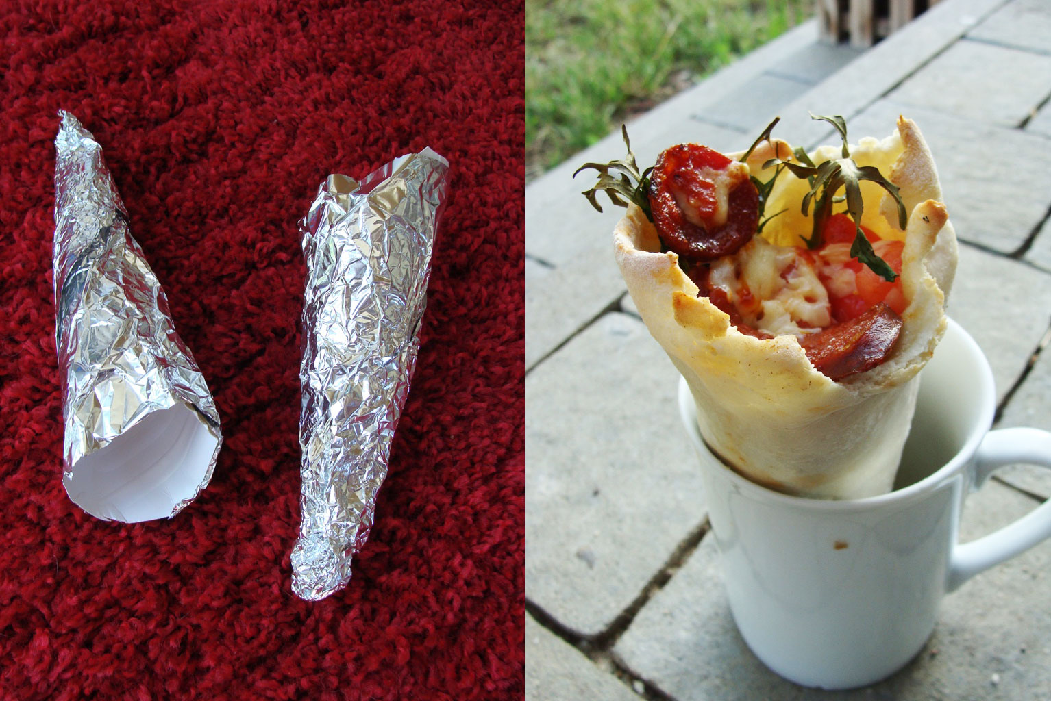 Pizza jest moim ulubionym daniem, nie tylko we Włoszech. Ale mamy lato, jest ciepło – może lepiej lody? A gdyby tak połączyć dwa w jednym? Zrobiłem więc rożki „lodowe” z pizzą. Oczywiście podaje się to na gorąco – ciasto jest z pizzy, nadzienie też. Do ich stworzenia wykorzystałem folię aluminiową Jana Niezbędnego 😉 – jak widać na zdjęciu.