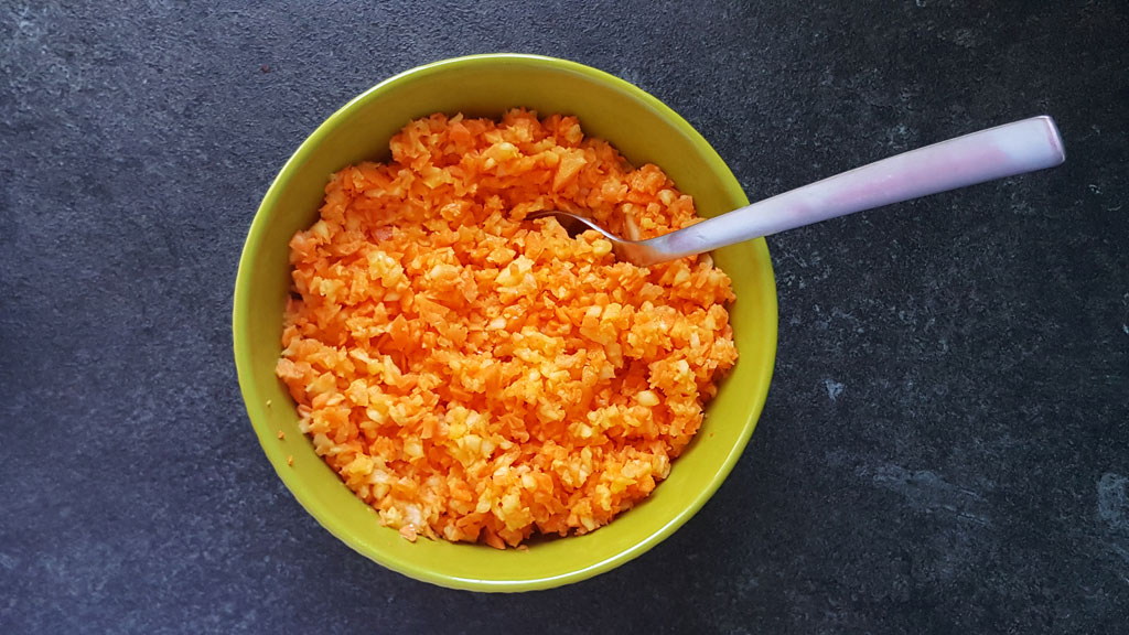 Surówka: Rozdrobnij malakserem marchewkę i jabłko lub zetrzyj na tarce. Dodaj pozostałe składniki i dobrze wymieszaj.