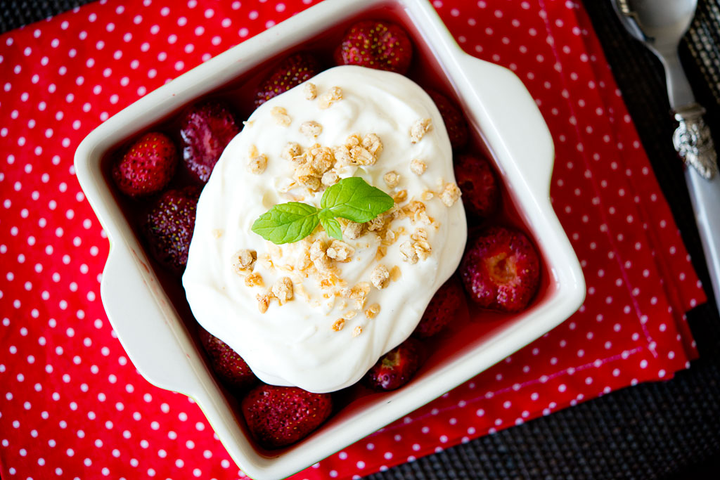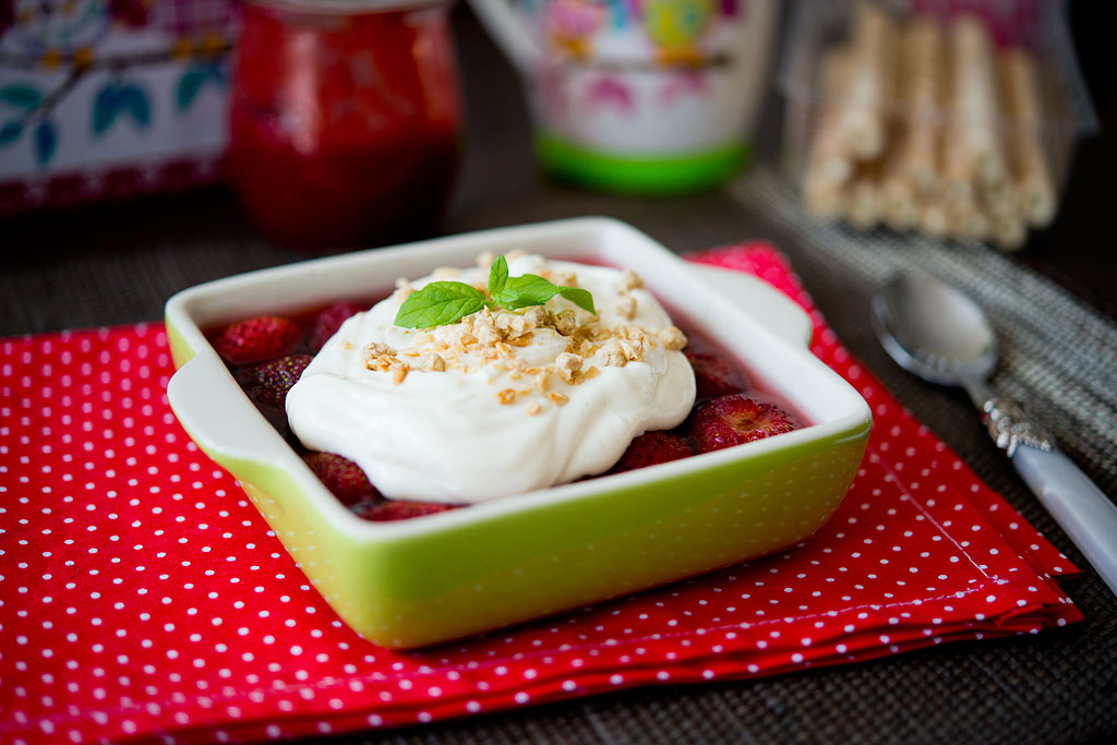 Super prosty deser ze składników, które w pierwotnej wersji miały dać mi serniczek na zimno z truskawkami i galaretką. Niestety, ze względu na deficyt czasu sernik nie powstał, ale powstał również pyszny, ale jednocześnie mniej pracochłonny deser. To po prostu truskawki zalane galaretką i podany ze słodkim twarożkiem lub (dla lubiących mniej słodkie desery) śmietaną / jogurtem greckim. Dla fajnego efektu chrupania dodałam jeszcze granolę i rurki z kremem. Ten ostatni dodatek to już szczyt rozpusty – polecam tylko tym, którzy nie muszą uważać na kalorie.