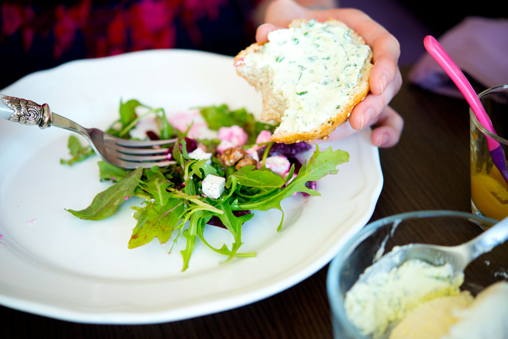 My zajadałyśmy sałatkę z bułeczkami pszennymi mojego wypieku z domowym masłem czosnkowo-pietruszkowym. Do resztki, którą mi została po wizycie Kasi dodałam pieczonego kurczaka (też został, po risotto ze szparagami i bobem) i zawinęłam w tortillę.