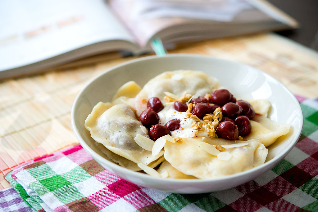 Podczas niedawnego pierogowania z Karmel-itką powstały nie tylko świetne wytrawne pierogi, m. in. pierogi z soczewicą i twarogiem. Zrobiłyśmy także wersję na słodko – z serkiem kremowym i wiśniami z kompotu i te pierogi widzicie na zdjęciu. Jakiś czas temu robiłam też podobne – pierogi z serem i limonką. Do twarogu pasują wszelkie owoce, np. jagody (najlepiej mrożone), prażone jabłka i inne.