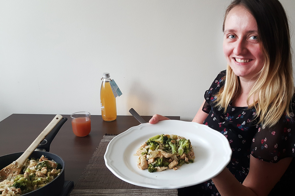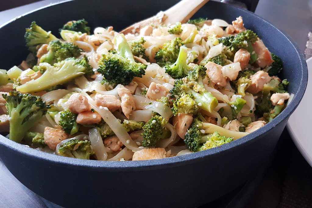 Poniżej przedstawiam przepis, którego autorką jest Natalia, która przybyła by zainspirować mnie do wykorzystywania w kuchni makaronu ryżowego. Zdecydowanie jej się to udało. Poniższe danie, mimo iż zawiera typowo azjatyckie składniki, z pewnością przypadnie do gustu osobom, które nie są fanami kuchni azjatyckiej (takimi jak ja). Dodatek sosu sojowego i oleju sojowego nadaje potrawie fajny, delikatny smak, ale nie jest nazbyt dominujące. Jak dla mnie super! W dodatku szybko się robi 🙂