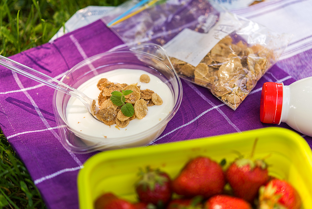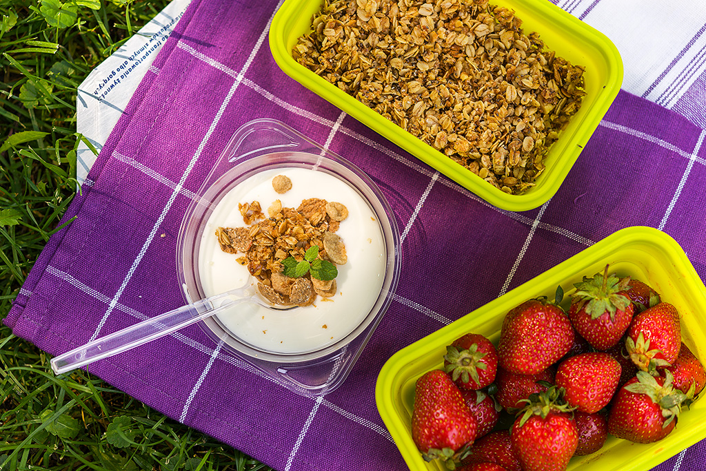 Wsyp płatki do jogurtu naturalnego i „zazgryzaj” truskawkami lub odszypułkuj i pokrój truskawki, umieść je w miseczce (np. jednorazowej Jana Niezbędnego) i zalej jogurtem. Następnie posyp płatkami. Możesz przygotować sobie porcję płatków w domu i włożyć do torebki strunowej Jana Niezbędnego. Tak jest najwygodniej.