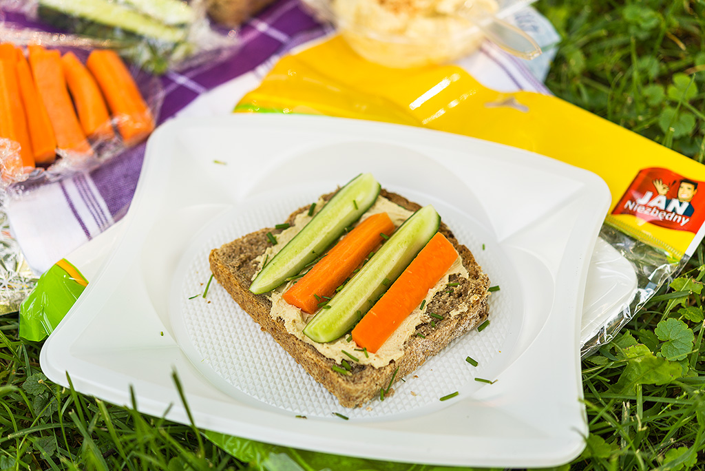 Chleb posmaruj hummusem. Na pikniku najlepiej zrobić to za pomocą noża jednorazowego Jana Niezbędnego. Jeśli masz możliwość posyp kanapkę świeżym szczypiorkiem. Podawaj ze słupkami warzyw, np. na jednorazowym talerzu Jana Niezbędnego.