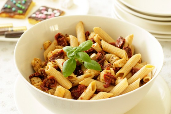 Umyj i oczyść filet z kurczaka. Pokrój na niewielkie kawałki i podsmaż z przyprawami. W międzyczasie ugotuj makaron (al dente oczywiście), odsącz suszone pomidory i fetę z zalewy. Pokrój suszone pomidory z jednego słoiczka. Z drugiego słoiczka wyciągnij tylko fetę. Połącz wszystkie składniki, dopraw świeżo mielonym pieprzem i podawaj.