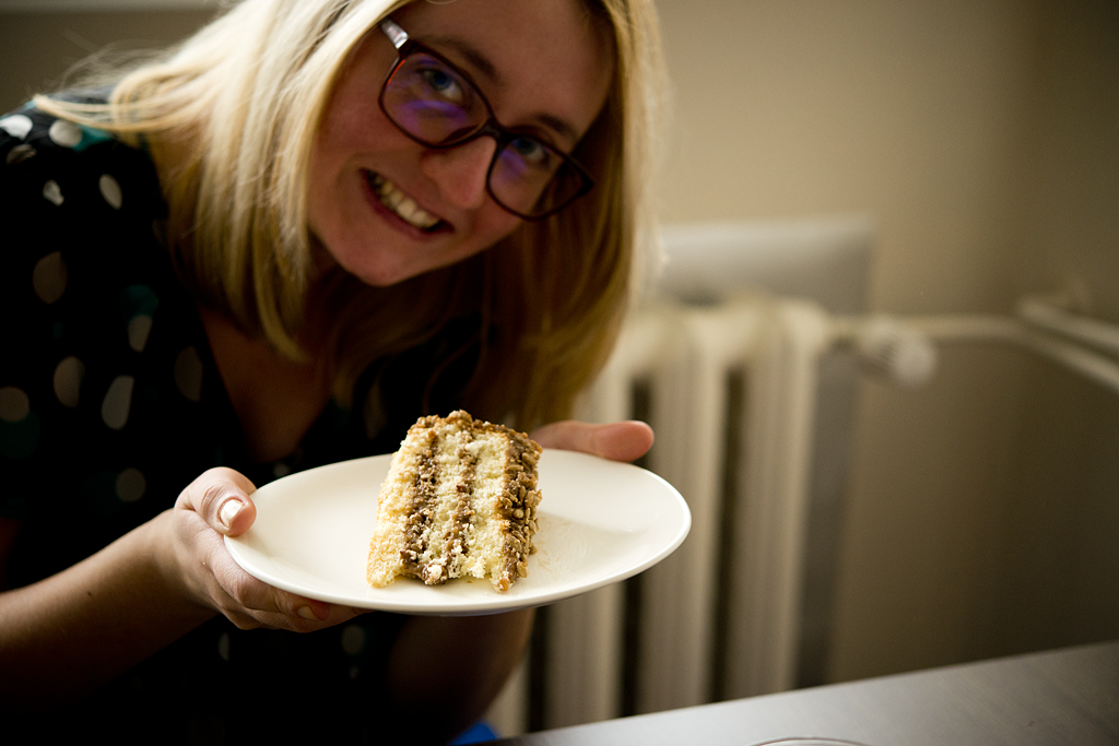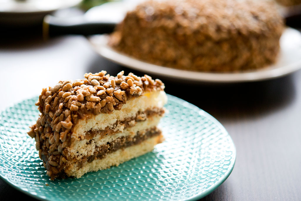 Krem karmelowy połączyłam z 3/4 ilości masy słonecznikowej. Reszta słonecznika „poszła” na wierzch. Blaty biszkoptowe nasączyłam wódką. Z Nutelli zrezygnowałam – bez niej ciacho też smakowało super.