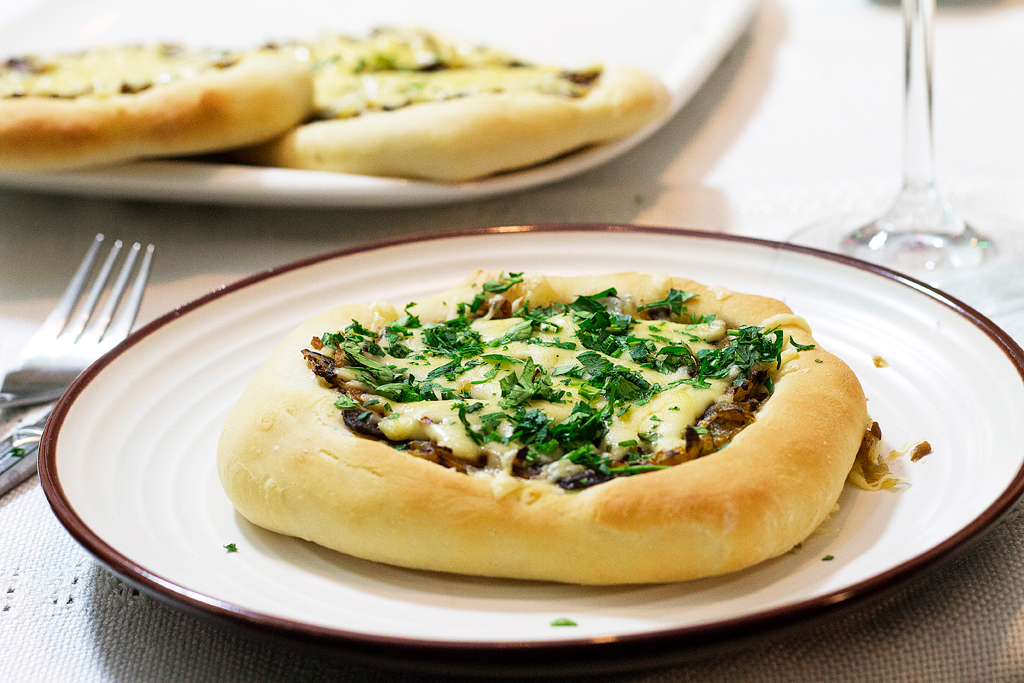 Pizzerinki: Wyrośnięte ciasto podziel na 8 części. Uformuj z każdej cienki placek o dowolnym kształcie, najlepiej z cieńszym środkiem i grubszymi brzegami. Odstaw pizzerinki do ponownego wyrośniecie, na ok. 15 minut. Rozłóż farsz z kapustą i pieczarkami, i piecz ok. 15 minut w temperaturze 180-200°C z termoobiegiem. Chwilę przed wyciągnięciem z piekarnika posyp pizzerinki startym serem. Podawaj z posiekaną natką pietruszki oraz ulubionym sosem: ketchupem, ketchupem cukiniowym, sosem czosnkowym lub dowolnym dipem.
