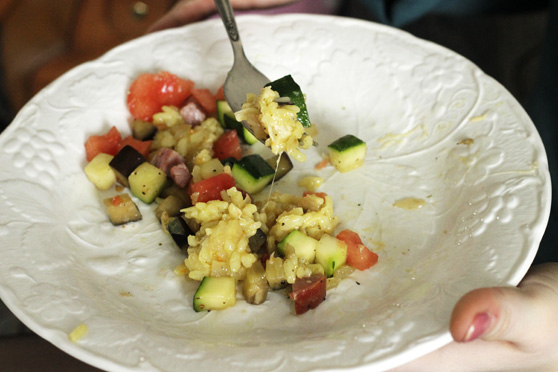 Oto lunch jaki zgotowałam w ten weekend razem z Lucy! Nie ma jak chillout przy garnkach z przyjaciółką… Przyrządziłyśmy risotto z cukinią, bakłażanem, szynką i dodanym na końcu pomidorem. Do samego risotto wmieszałyśmy ser Rubin, a warzywa doprawiłyśmy ognistą mieszanką przypraw. Było bardzo smacznie i oczywiście przemiło! Życzcie mi więcej czasu na takie spotkania!