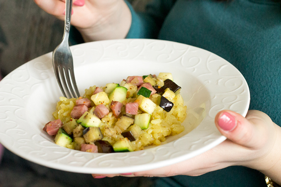 Ale to na samym końcu. Wcześniej, gdy ryż jest już ok (al dente w środku, ale nie za twardy), dorzucam to na co mam akurat ochotę albo to co znajdę w lodówce: warzywa (kukurydza, groszek, podsmażona cukinia, podgotowany kalafior, brokuły etc.), mięso (np. resztki pieczonego kurczaka, resztki kabanosa, szynki, etc.), krewetki, grzyby, zioła, przyprawy… Różnie to bywa.