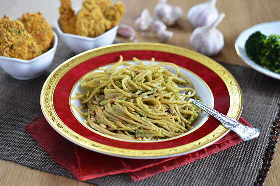 Miał być makaron z pesto pietruszkowym na bazie nerkowców (jak w tym pesto z rukoli i nerkowców), z dodatkiem bobu. Ale niestety, nie mogłam nigdzie kupić bobu… A potem znaleźć nerkowców w szafie. Ostatecznie powstał miks pt. słonecznik-brokuły. Super połączenie!