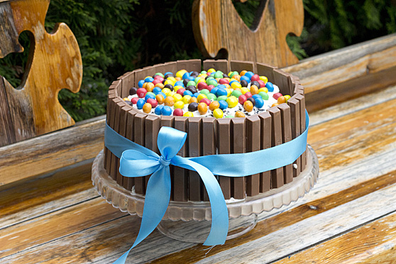 Przełóż ciasto czekoladowe kremem z mascarpone. Boki tortu obłóż batonikami typu KitKat (tymi małymi) lub WW, a wierzch posyp drażetkami M&M’s.