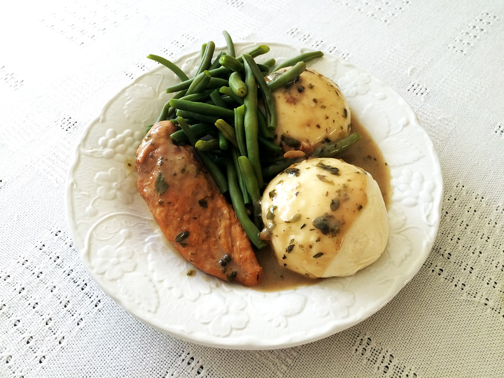 Poniżej danie inspirowane powyższym przepisem. Tym razem nie dodałam jednak borowików, a zamiast indyka użyłam filet z piersi kurczaka, który doprawiłam majerankiem, tymiankiem, białym pieprzem oraz czosnkiem. Dodatki to (jak widać) pyzy i fasolka szparagowa (z ogródka Mamy). Dobrze pasują do takiego zestawu również buraczki ze słoika. Polecam 🙂