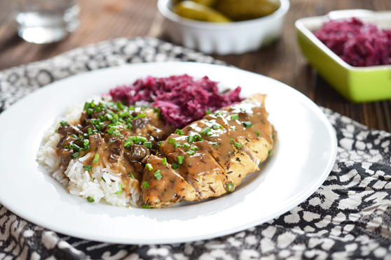 Podawaj sos borowikowo-pieczeniowy z ryżem, szczypiorkiem i warzywami. My wybraliśmy słodkawą modrą kapustę ze słoika i kwaśno-słone ogórki kiszone. Bardzo udane połączenie.
