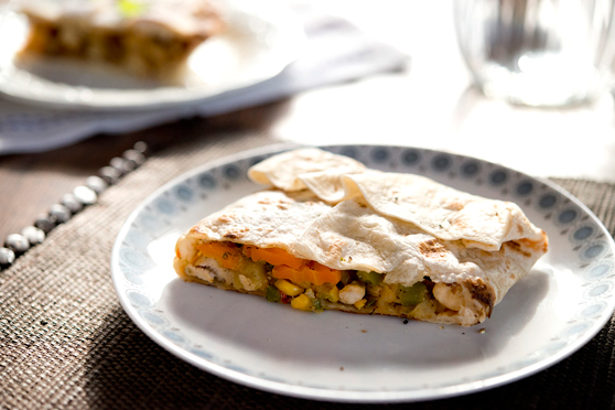 Tortille umieszczaj na rozgrzanej patelni. Zrumień z jednej strony. Odwróć, na środek ułóż plastry sera. Dodaj farsz warzywny i w dowolny sposób zwiń (u nas wyszły koperty).