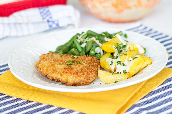 Podawaj upieczone ziemniaczki polane sosem koperkowym i z dodatkowym, posiekanym świeżym koperkiem, w towarzystwie kotletów schabowych w panko i fasolki szparagowej z migdałami. Oczywiście kotlety świetnie pasują również do purée ziemniaczanego i każdej surówki lub gotowanych jarzyn.