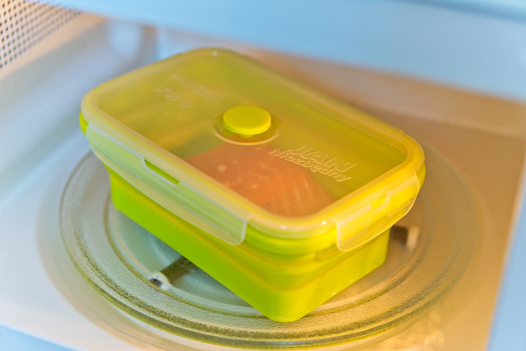 Łososia umieść w pojemniku silikonowym (u mnie od Jana Niezbędnego). Zamknij pojemnik, upewnij się, że kolorowy wentylek pozostał uchylony, a następnie wstaw do kuchenki mikrofalowej. Mikrofaluj na najwyższej mocy ok. 2 minuty.