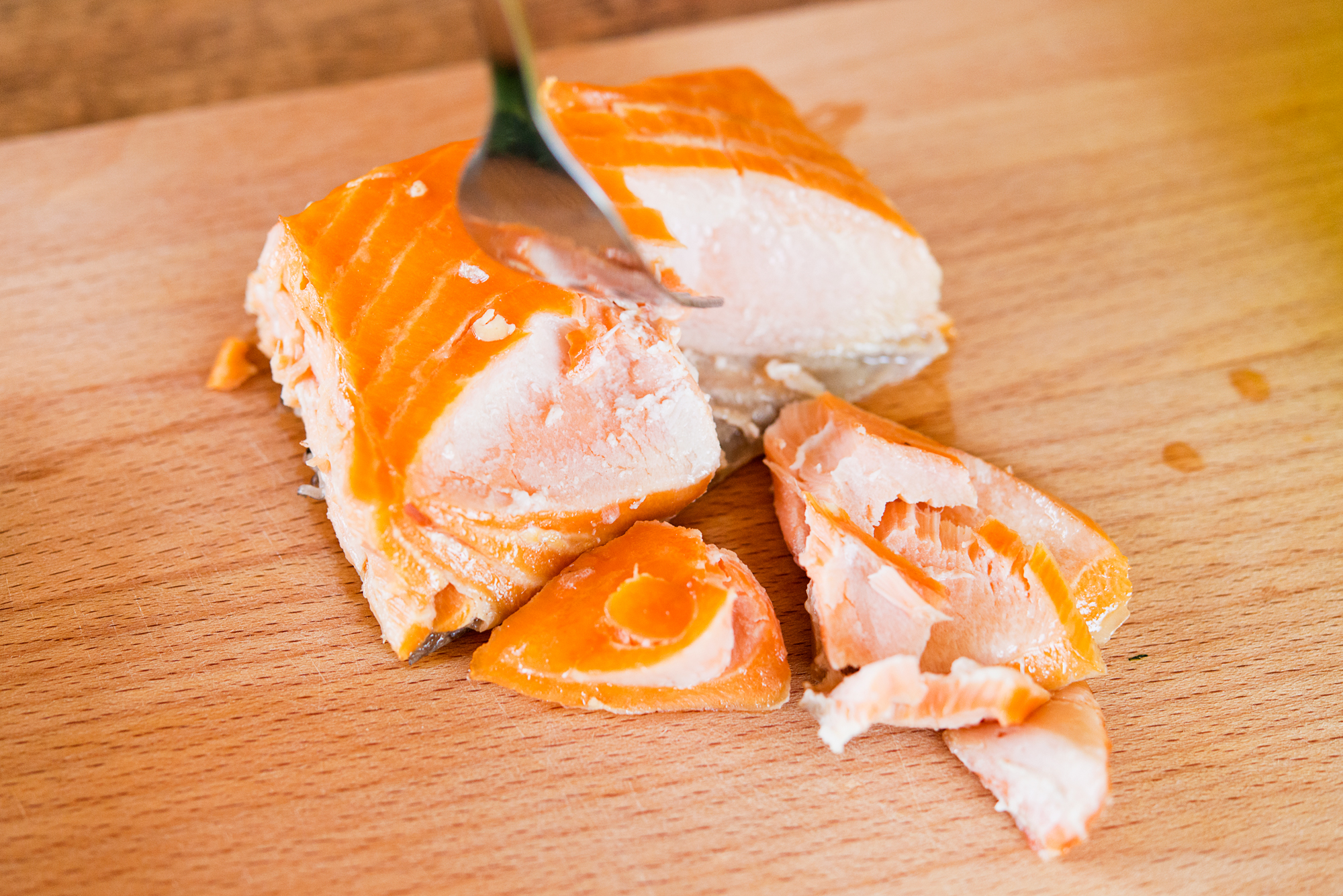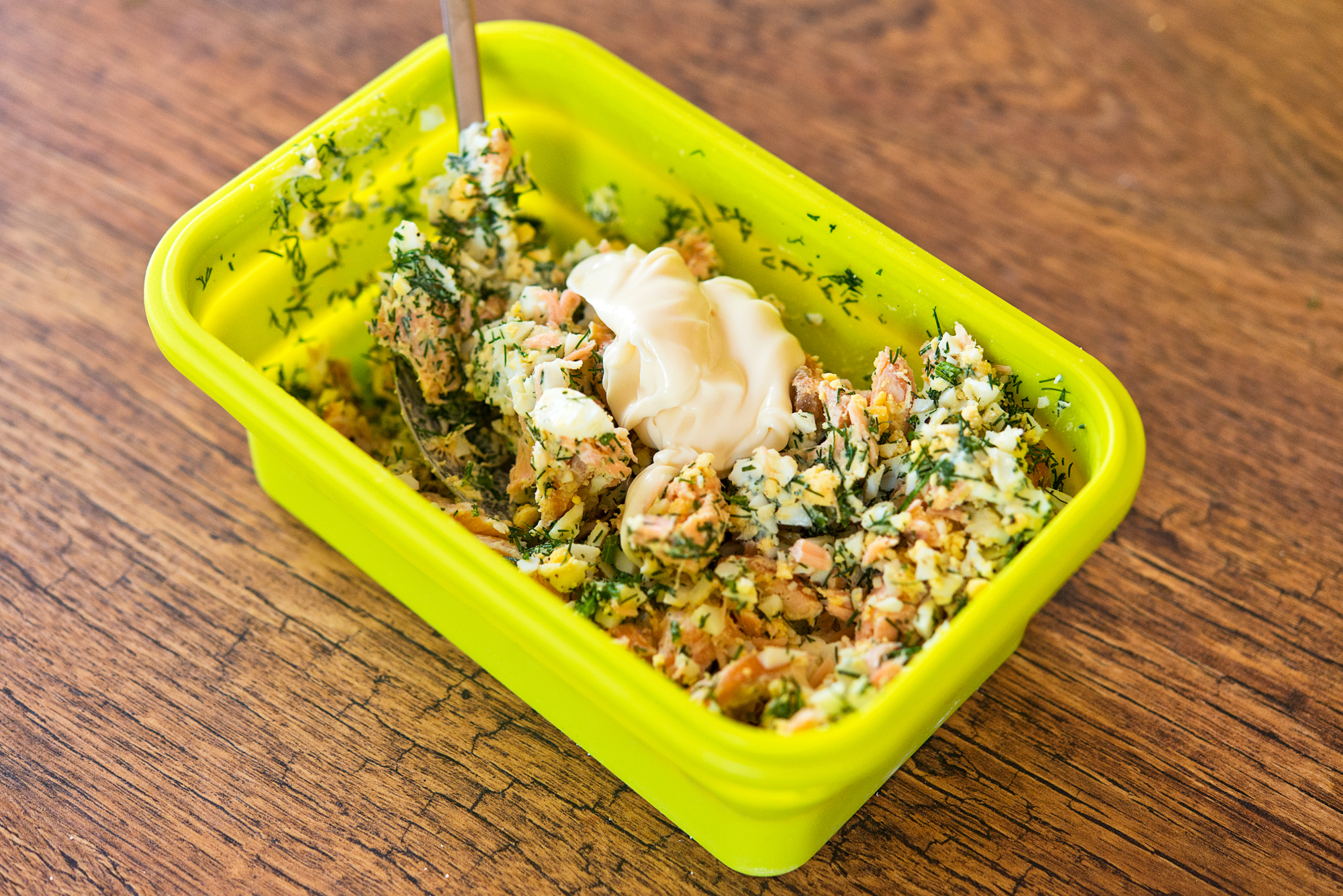 Gdy łosoś nieco przestygnie rozdrobnij go widelcem i przełóż ponownie do pojemnika silikonowego.
