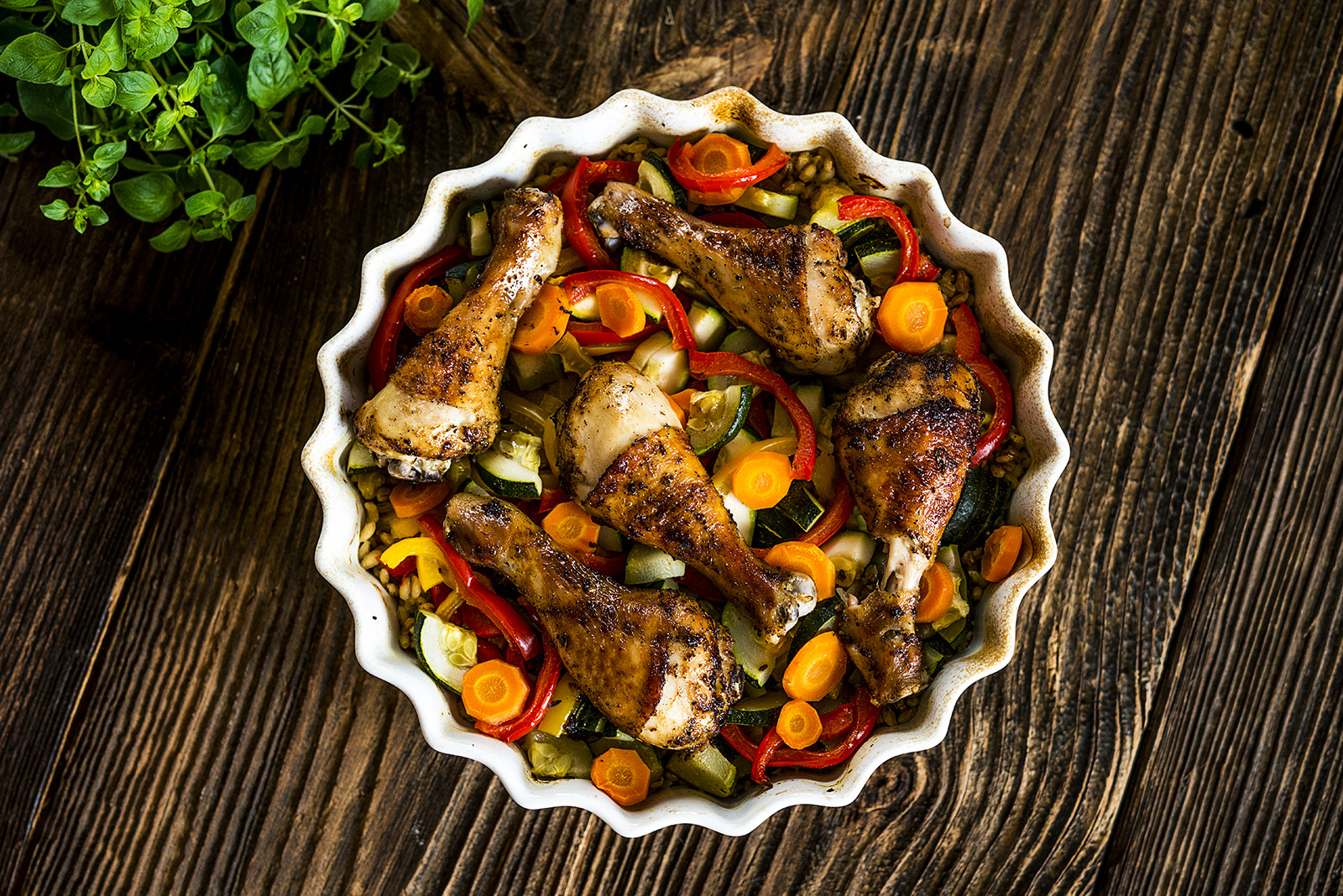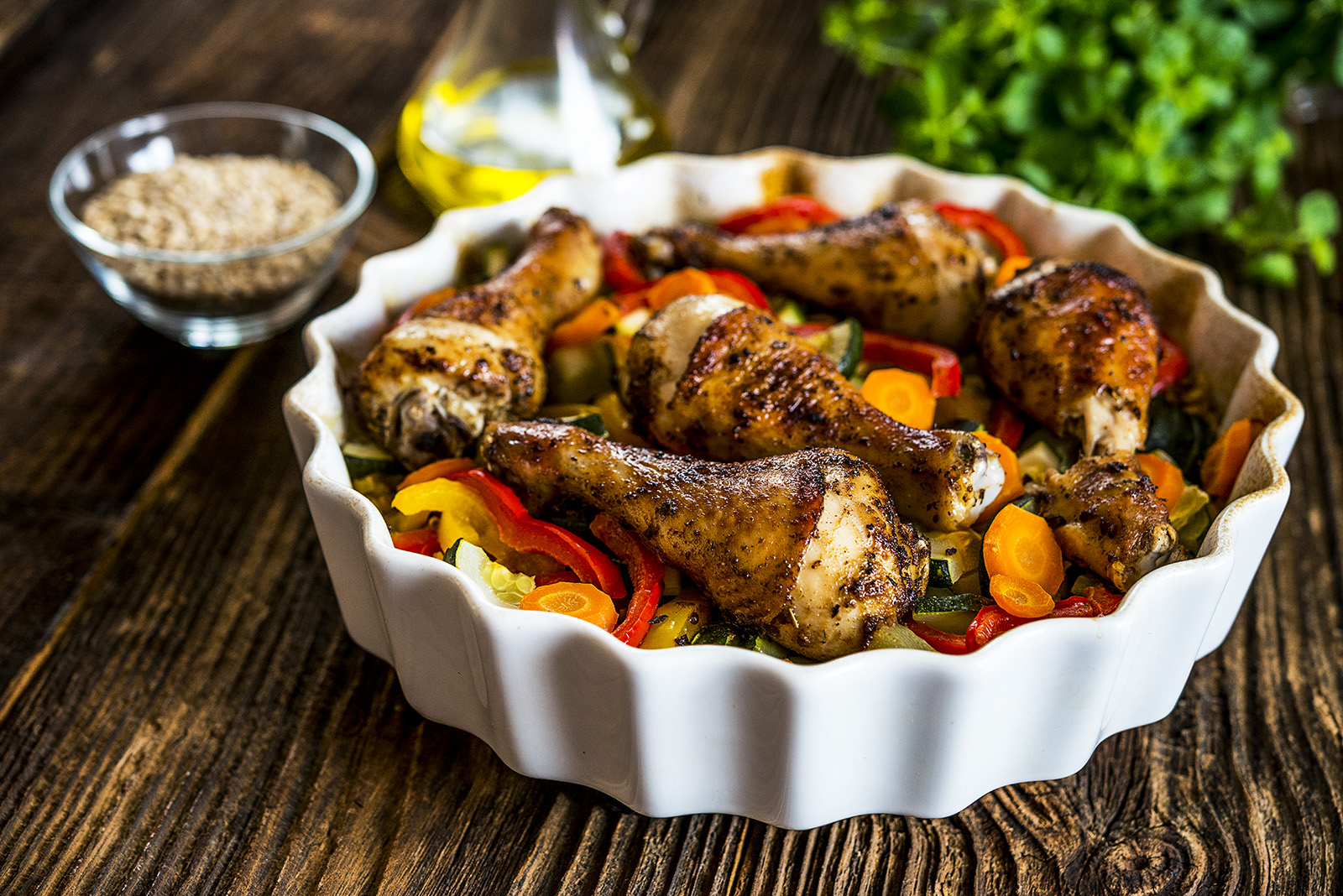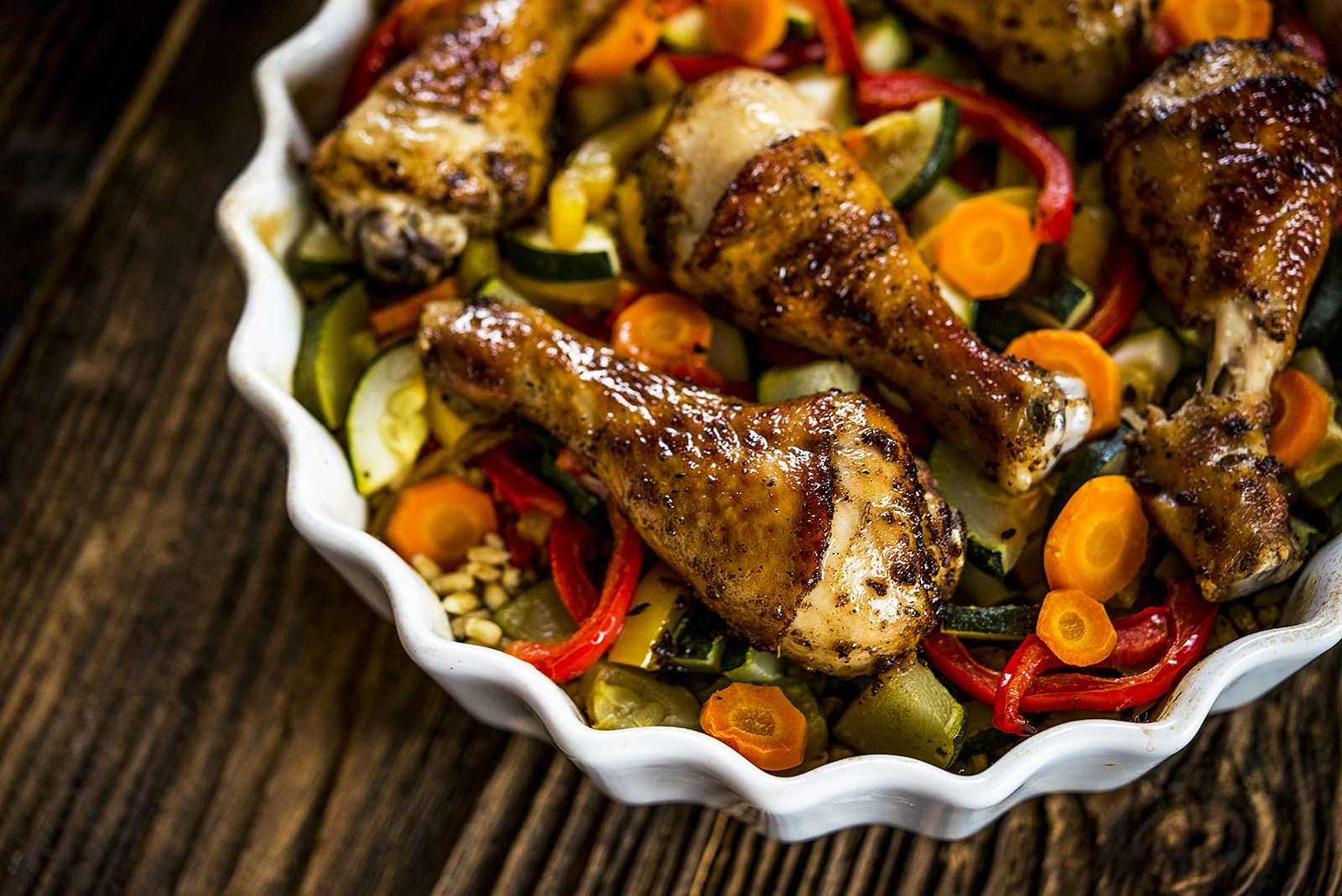 Pałki z kurczaka „Nasz Kurczak” umyj i wymieszaj z niewielką ilością oleju oraz przyprawy Cajun. Umieść na warzywach, w naczyniu żaroodpornym. Przykryj naczynie dołączoną do zestawu pokrywką lub folią aluminiową i wstaw do piekarnika nagrzanego do 180°C na ok. 1h.