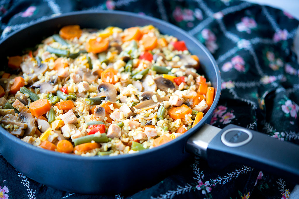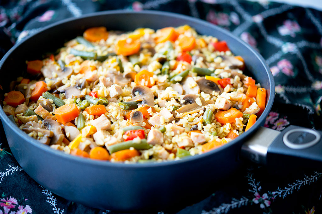 Lekka i bardzo smaczna patelnia z mało znaną kaszą bulgur, którą dopiero odkrywam. W towarzystwie warzyw i mięska drobiowego sprawdziła się wybornie – z pewnością częściej będzie gościła w naszej kuchni 🙂 Polecam gorąco.