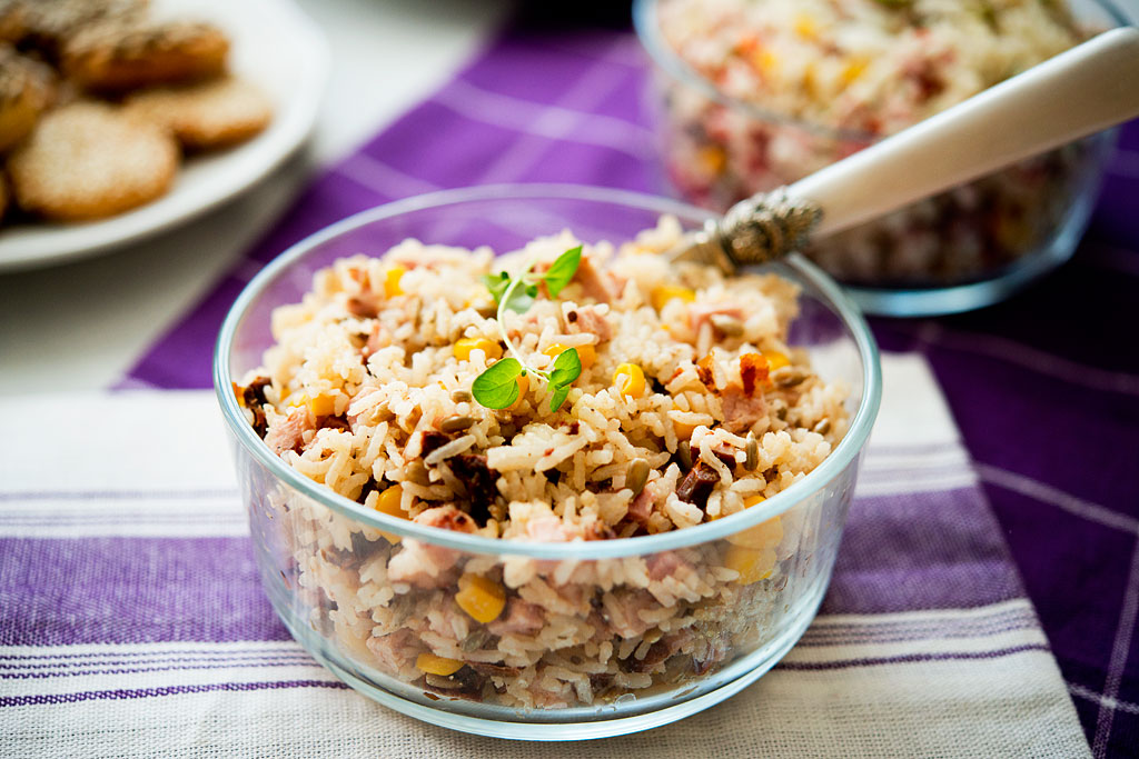 Dwie szybciutkie sałatki, które powstały na bazie pysznej wędlinki wieprzowej i ryżu. Robiłam je bardzo na oko, więc nie podaję proporcji. Grunt żeby wymieszać je tak jak się lubi 🙂